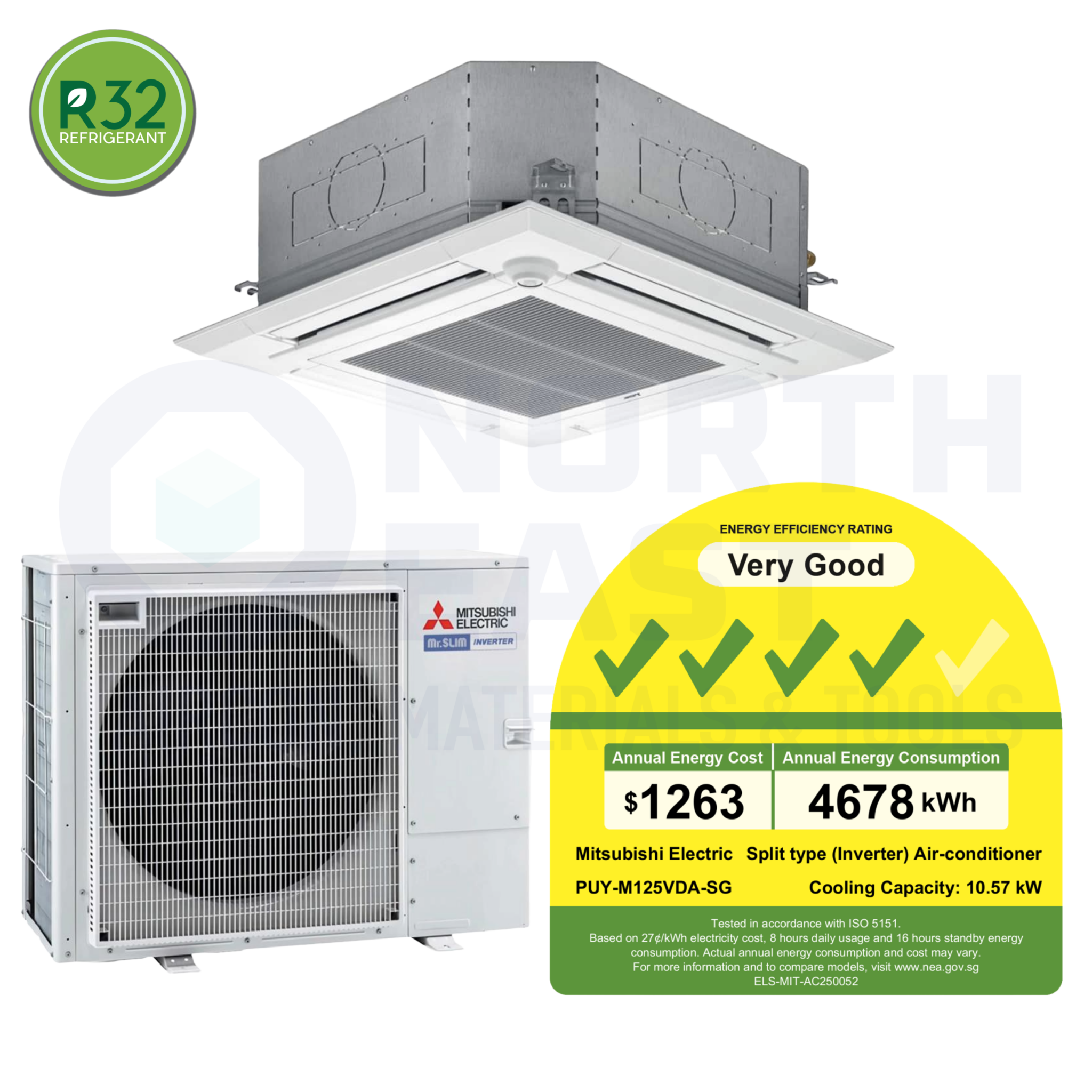 Mitsubishi Electric PUYM125VDASG/PLYM125EA3 Cassette Aircon Capacity: 11.4kW NEA Rating: 4 Ticks Refrigerant Gas: R32 Type: Cassette